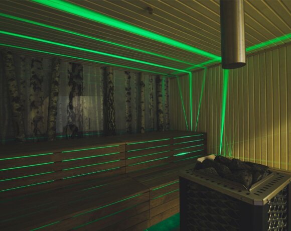 Zewnętrzna sauna w lokalnym klimacie, gdzie organizowane są relaksacyjne seanse z wykorzystaniem naturalnych olejków aromaterapeutycznych. Sauna nabiera prawdziwego uroku wieczorną porą, gdy piękna kolorystyka świerku współgra ze światłami w saunie.