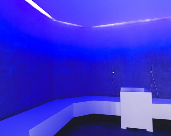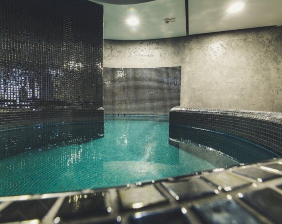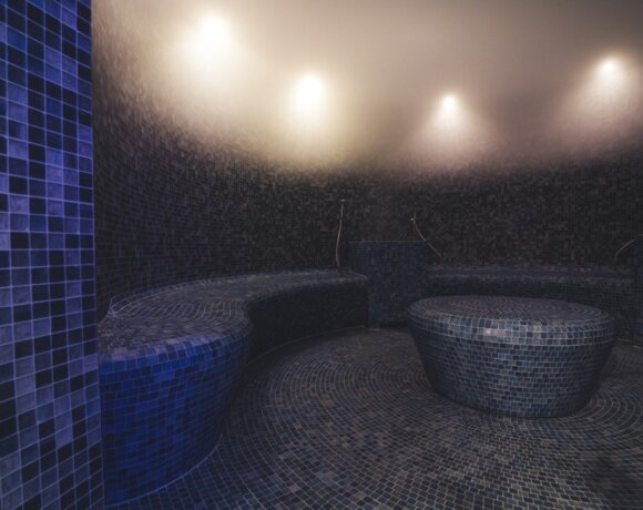 Łaźnia o okrągłym kształcie wykonana z mozaiki w wielu odcieniach błękitu przywodzi na myśli egzotyczne wakacje. Wilgotność sięga 100 procent, a temperatura dochodzi do 50°C. Pachnąca para delikatnie otula ciało i powodując rozluźnienie mięśni. W łaźni odbywają się również peelingi, przygotowane przez naszych saunamistrzów